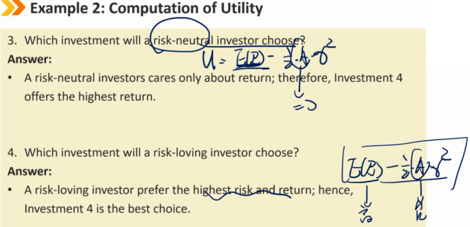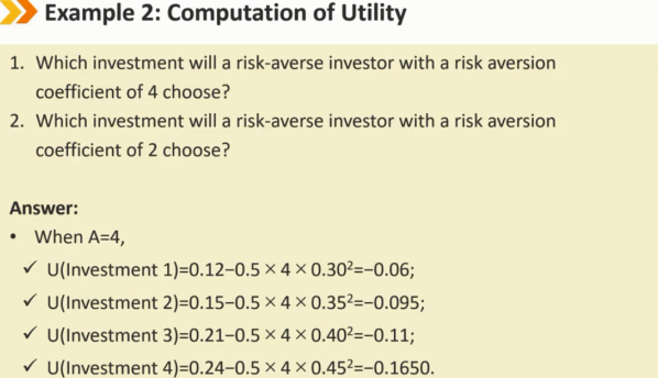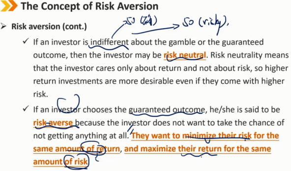 如果投资者选择了有保证的结果,他/她被认为是风险厌恶者,因为投资者不想抓住根本得不到任何东西的机会。他们希望在相同的收益下最小化风险,在相同的风险下最大化收益。