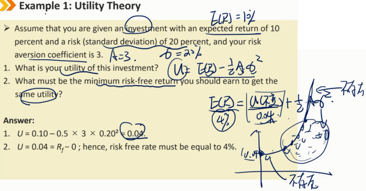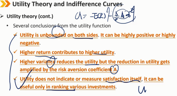 效用理论(续) 效用函数的几个结论: 两边的效用都是无限的。它可以是高度积极的,也可以是高度消极的。 更高的收益有助于更高的效用 较高的方差会降低效用(当A>0时),但效用的降低会被风险厌恶系数A放大 效用本身无意义,并不表示或衡量满意度,它只能用于对各种投资进行排名