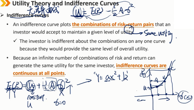 因为无限多的风险和回报组合可以为同一投资者产生相同的效用,所以无差异曲线在所有点上都是连续的。