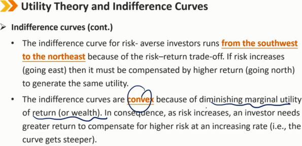 无差异曲线(续) 风险厌恶型投资者的无差异曲线从西南向东北延伸,因为风险-回报权衡如果风险增加(向东),则必须通过更高的回报(向北)来补偿,以产生相同的效用。 无差异曲线是凸的,因为回报(或财富)的边际效用递减。因此,随着风险的增加,投资者需要更高的回报率来补偿更高的风险(即曲线变得更陡)