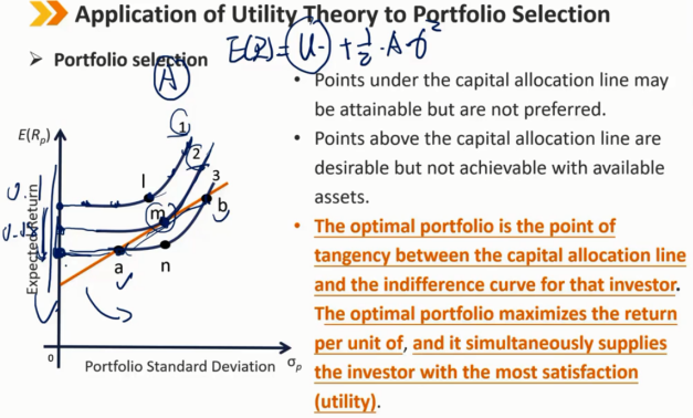 最优投资组合是该投资者的资本配置线和无差异曲线之间的切点。最优投资组合使每单位资产的收益最大化,同时为投资者提供最大的满意度(效用)。