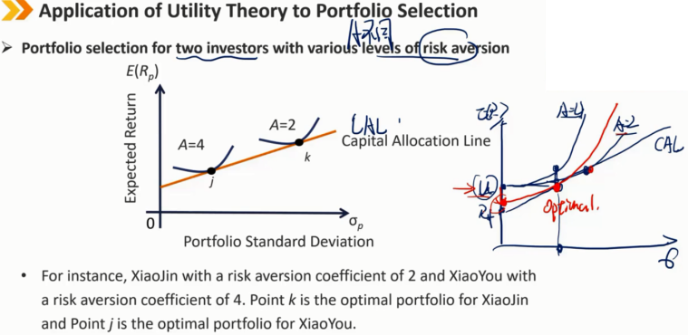 例如,小金的风险厌恶系数为2,小友的风险厌恶系数为4。k点是小金的最佳投资组合,j点是小友的最佳投资组合。