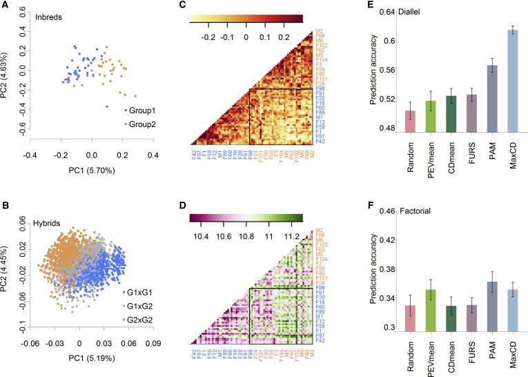 对于小麦这一仍处于杂交育种早期的作物,作者使用了(Zhao et al., 2015) 的文章中由72个适应于欧洲中部(Central Europe)构成的2556个杂交小麦数据集进行测试。这些自交系已被分成两组,分别属于两个杂种群体的各36个品系。基于基因型数据的PCA图表明,这两组之间的分离不强(图4 A和4B),这与缺乏密集的发散选择(the lack of intensive divergent selection)相符。通过分级聚类对近交种进行排序后,从基因组关系矩阵中出现了可检测的分组模式(图4 C)。从表型上看,组间杂种的平均籽粒产量为10.833 Mg ha -1,略高于两组中每组的杂交平均数(10.827Mg/ha和10.670Mg/ha)(图4 D),总体上与基因组关系矩阵的预期一致。