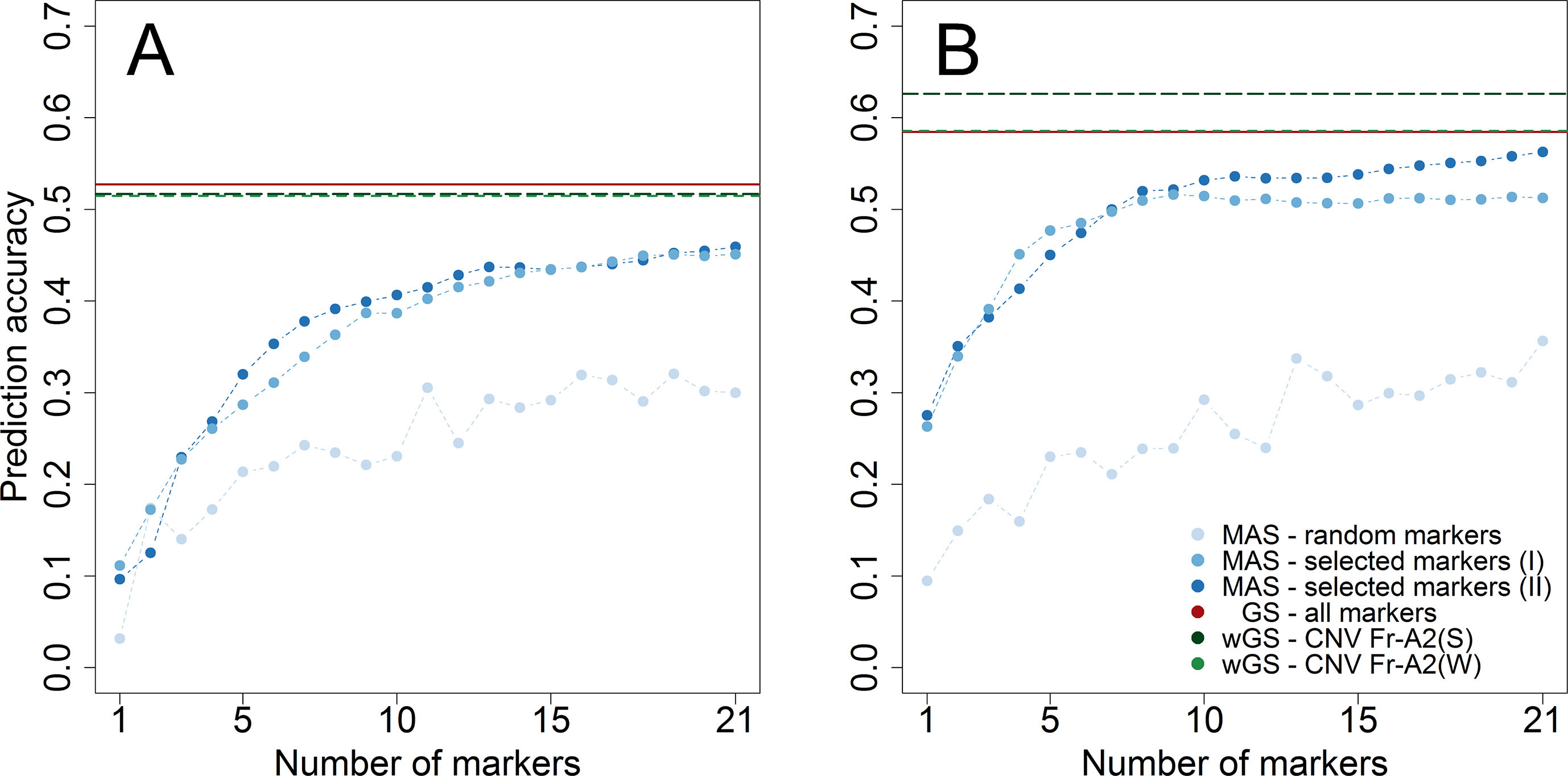 对于抗冻性的预测也可以进行类似的发现,其中用预选标记辅助预测的效果仅比基因组预测(rGS=0.585)稍差(rMAS=0.563)。后者可以通过将Fr-A2基因座的拷贝数变异与单倍体CNV Fr-A2(S)作为固定效应(rwGS=0.626)相关联的模型来进一步改进。
