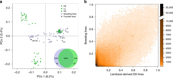 a.对66个地方品种衍生DH系和65个繁殖系(三角形)进行了基于成对修正Rogers距离的主坐标分析,其中包括4个显著的 founder 系(倒三角形)。从三个DH库,KE(圆形),LL(正方形)和PE(菱形)中随机抽取22条线。轴标签显示按主坐标解释的百分比方差。Venn图显示了941个地方品种DH系(LR)和65个欧洲育种系(BL)之间456911个单倍型的重叠。为10个SNPs的非重叠基因组窗口构建单倍型。