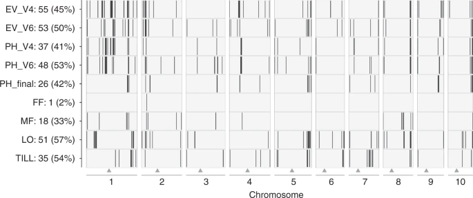 黑色竖线表示与899个地方品种衍生的DH系中的9个性状(y轴)显着相关的基因组区域的位置。在X轴显示玉米的十条染色体。三角形标记了每个染色体的着丝粒位置。y轴代表性状,每性状显著区域的数量,以及百分比遗传变异说明。