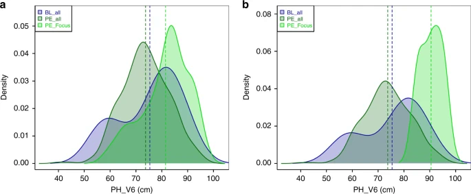 14个育种系(BL琰all)、402个地方品种DH系以及a在3号染色体上携带聚焦单倍型(haplotype A in Fig. 3a; PE_Focus, 38 lines)和在9号染色体上携带b聚焦单倍型(haplotype D in Fig. 3a; PE_Focus; based on three data points only)。垂直线表示每组的平均值。