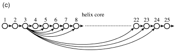 跨膜螺旋核心的模型如图1c所示。它由25个相同的状态组成,有可能从某一状态(如图中的状态3)跳到下游的许多状态。此拓扑对长度在5到25之间的序列进行建模。当包括cap时,这将转换为15到35之间的螺旋长度。这与已知结构的膜蛋白中螺旋长度的分布是一致的(Bowie,1997)。