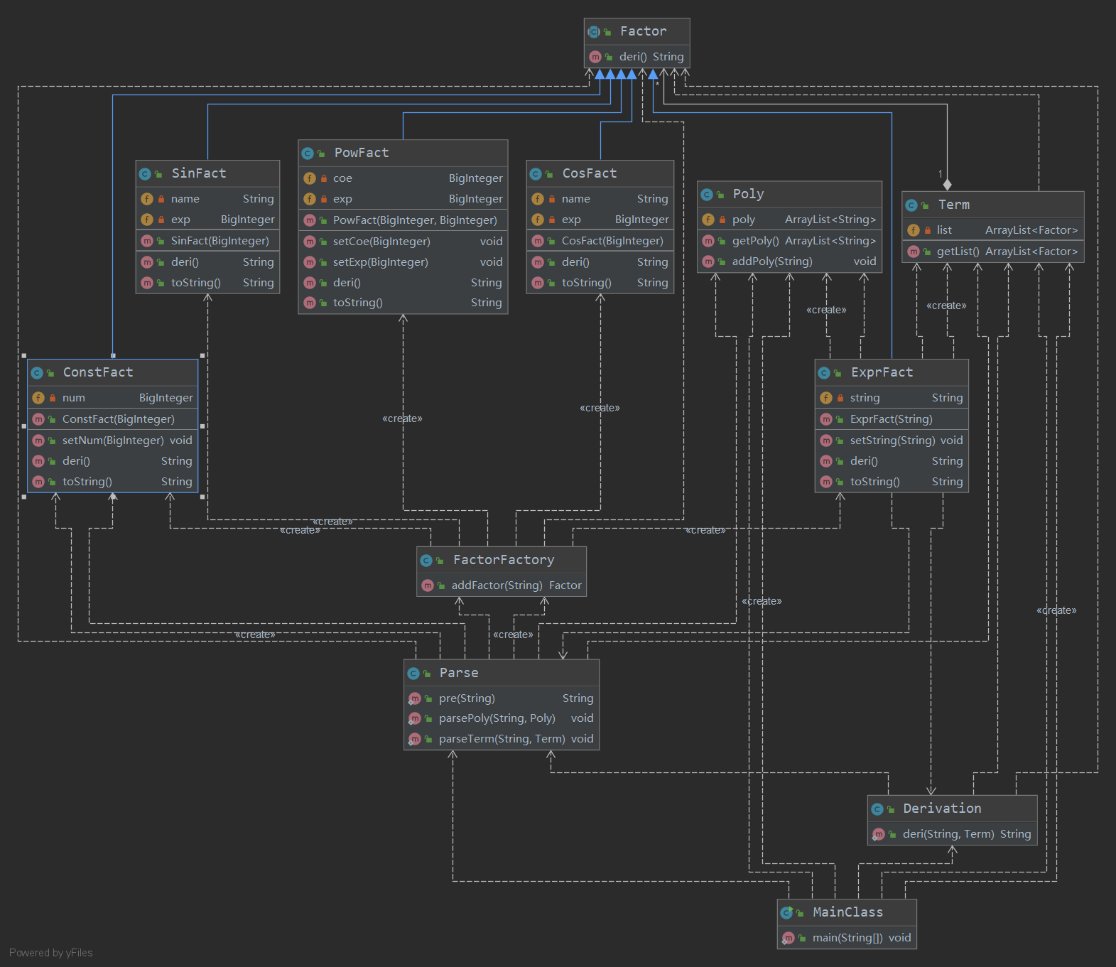新增Factor类,PowFact、ConstFact、SinFact、CosFact、ExprFact均继承此类,并实现相应的deri和toString方法。
