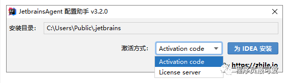 2、 配置助手会提示您,需要使用哪种激活方式,这里我们选择默认的 Activation Code,通过注册码来激活,点击为IDEA安装: