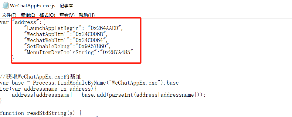 来到已下载的脚本./tools/WeChatAppEx.exe.js文件中,修改addres参数为对应的版本address。