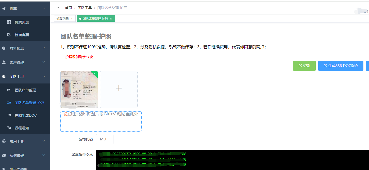 下面我提供一种快速的解决方案:大体思路就是通过图像识别获取护照信息,然后生成ETERM指令。