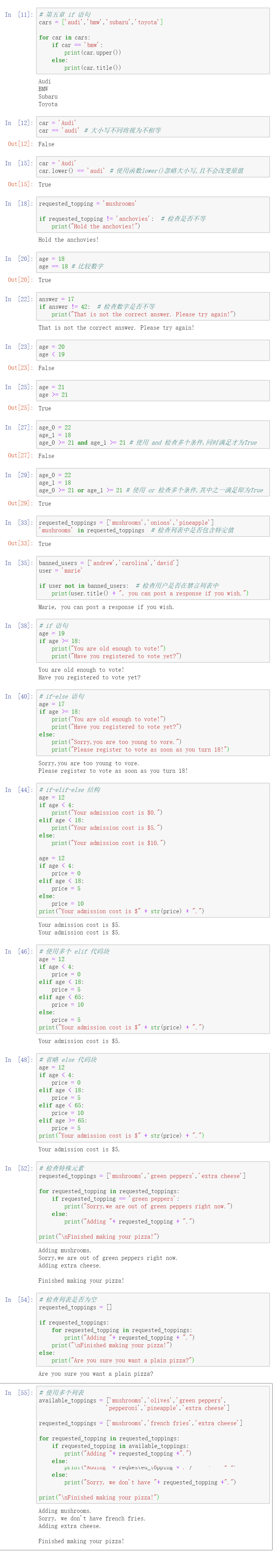 - Python 并不要求 if-elif 结构后面必须有 else 代码块。在有些情况下, else 代码块很有用;而在其他一些情况下,使用一条 elif 语句来处理特定的情形更清晰: