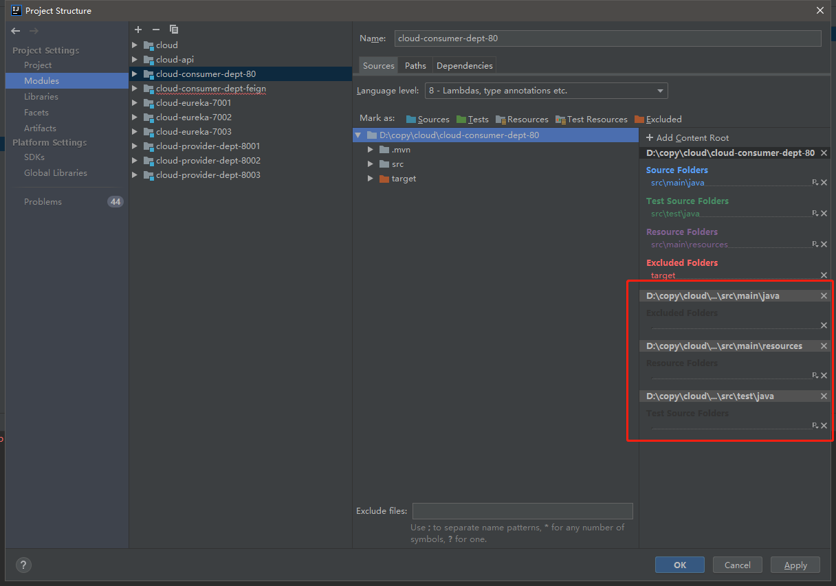 module "cloud-consumer-dept-feign" must not contain source root "D:\copy\cloud\cloud-consumer-dept-feign\src\test\java". The root already belongs to module "cloud-consumer-dept-80"