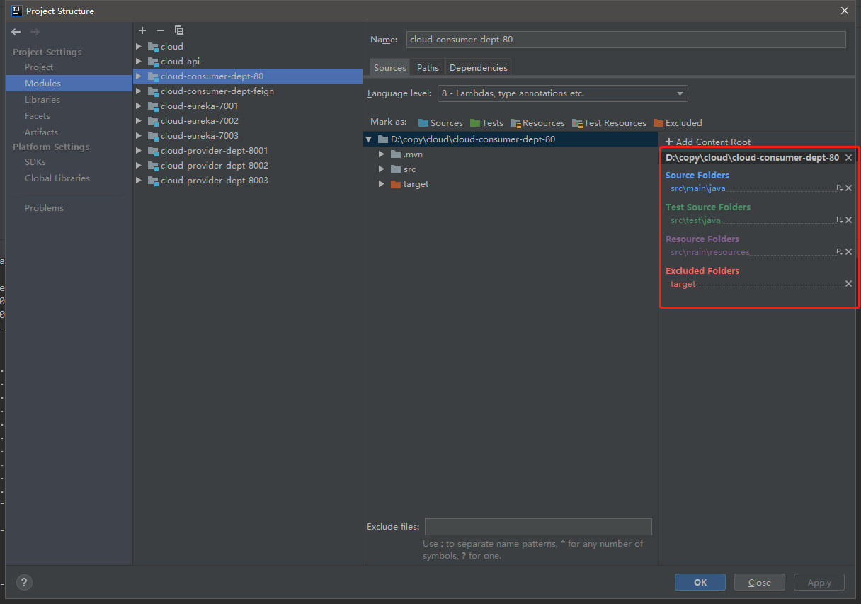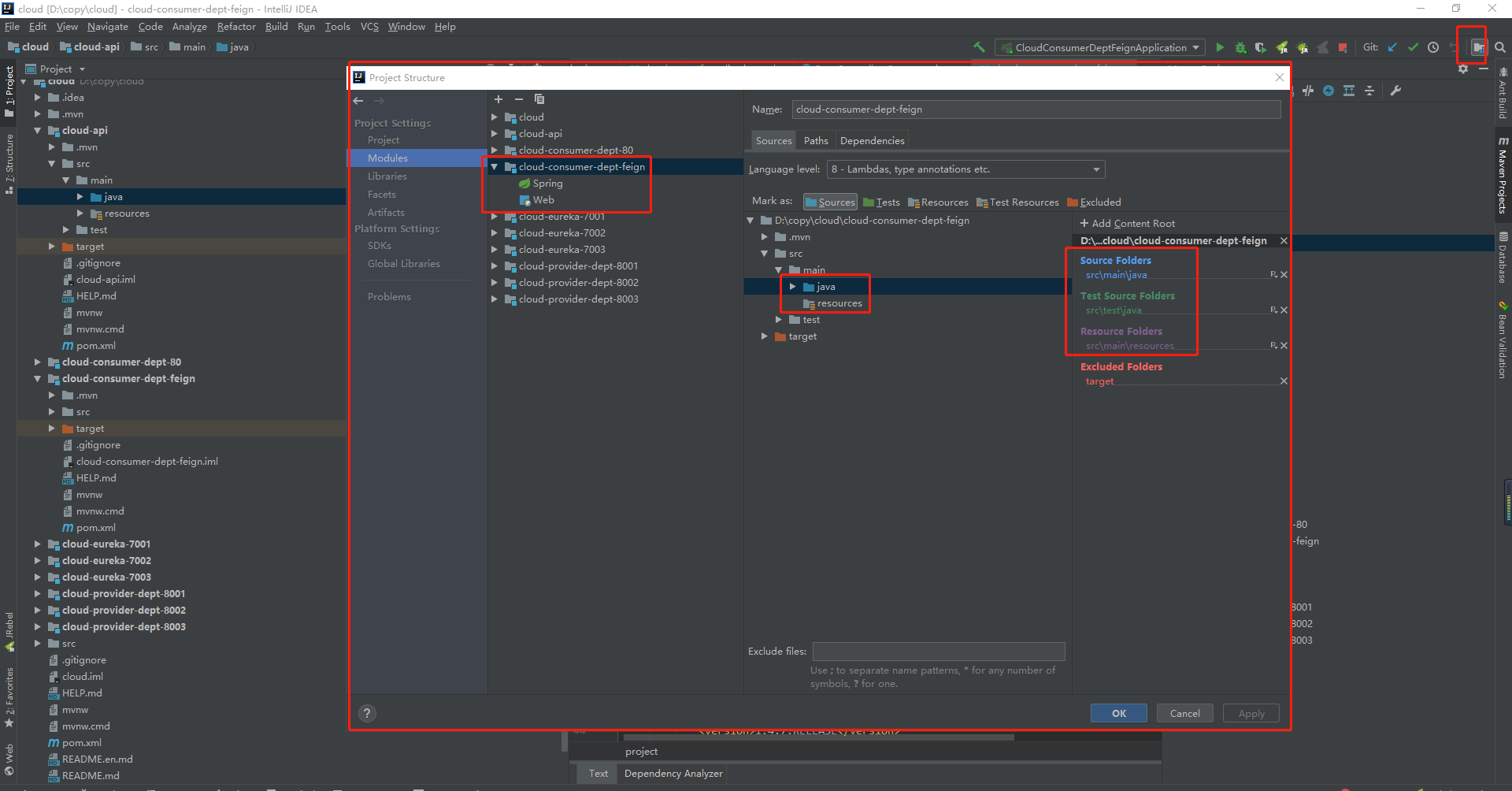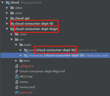 在cloud-consumer-dept-80的Project Structure设置中多了cloud-consumer-dept-feign的资源目录