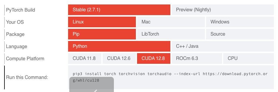 在Pytorch官网选择对应版本的Pytorch,查看安装指令。