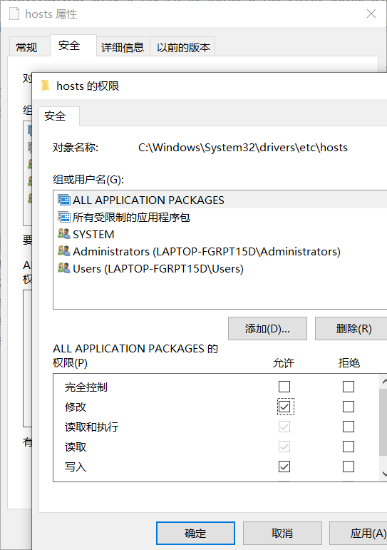 找到hosts文件后右键安全属性,高级设置,配置权限为允许修改和写入即可。