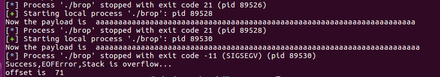 这里需要注意下,使用sendline发送数据时会自动补上换行符,所以使用sendline的跑爆破出来的偏移地址需要手动+1,使用sendline爆破出来的效果如下: