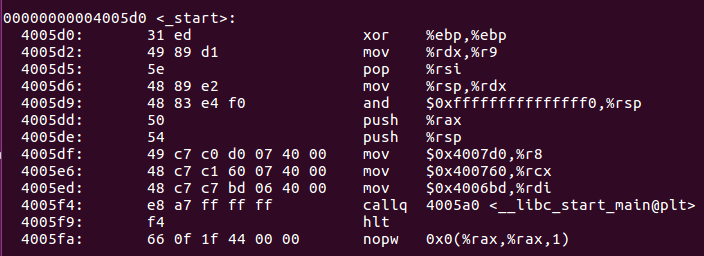 接下来我们使用objdump查看0x4005d0处的汇编语言,在真实情况下我们看不到这一块内容: