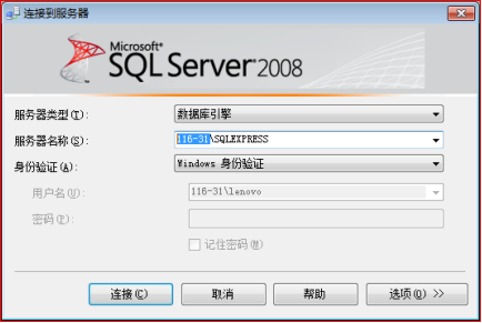 6. 打开SQL Server Management Studio,连接到数据库引擎服务器。注意选择服务器名称及安装实例,初次连接建议选择Windows身份验证方式。