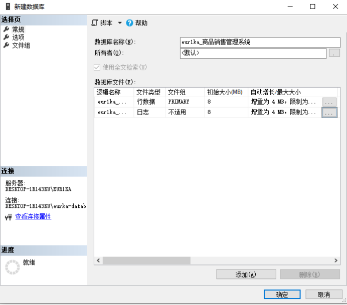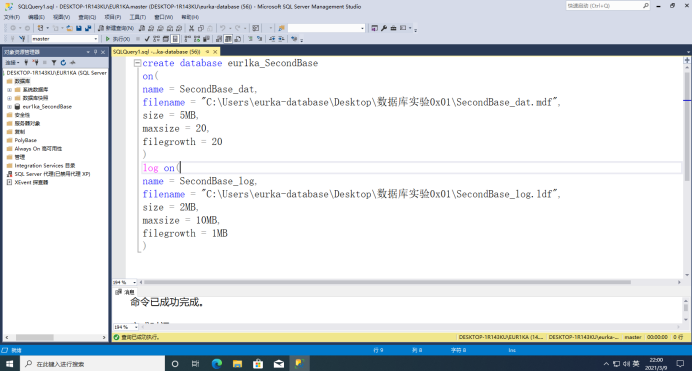 •逻辑文件名为SecondBase_dat,物理文件名为: SecondBase_dat.mdf,存储在“C:\Users\eurka-database\Desktop\数据库实验0x01”文件夹下。
