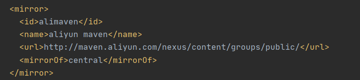 maven默认使用的中央仓库连接的是国外服务器,改为使用阿里云的。在上述文件中的 <mirrors></mirrors>标签对中加入以下内容