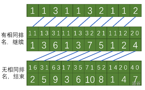 重复这个步骤,直到所有 \(rank_i\) 都不相同为止。然后求出来的 \(rank\) 就是我们要求的排名数组的。