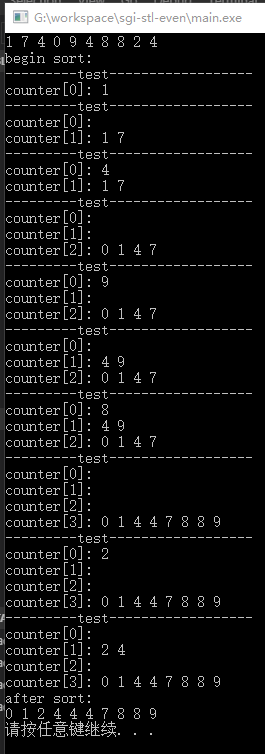 template<class T> void print(const STD::list<T>& list) { //打印链表 for (auto it = list.begin(); it != list.end(); ++it) { std::cout << *it << " "; } std::cout << std::endl; } template<class T> void sort(STD::list<T>& list) { if (list.size() <= 1) return; STD::list<T> carry; STD::list<T> counter[64]; int fill = 0; while (!list.empty()) { carry.splice(carry.begin(), list, list.begin()); int i = 0; while (i < fill && !counter[i].empty()) { counter[i].merge(carry); carry.swap(counter[i++]); } carry.swap(counter[i]); if (i == fill) ++fill; //打印本次循环的所有递归层次内容 std::cout << "---------test------------------" << std::endl; for (int i = 0; i < fill; ++i) { std::cout << "counter[" << i << "]: "; print(counter[i]); } } for (int i = 1; i < fill; ++i) counter[i].merge(counter[i-1]); list.swap(counter[fill-1]); } void list_test() { STD::list<int> list; for (int i=0; i<10; ++i) { int r = rand() % 10; list.push_back(r); } STD::list<int>::iterator iter = list.begin(); for ( ; iter != list.end(); ++iter) { std::cout << *iter << " "; } std::cout << std::endl; std::cout << "begin sort:" << std::endl; sort(list); std::cout << "after sort:" << std::endl; iter = list.begin(); for ( ; iter != list.end(); ++iter) { std::cout << *iter << " "; } std::cout << std::endl; }