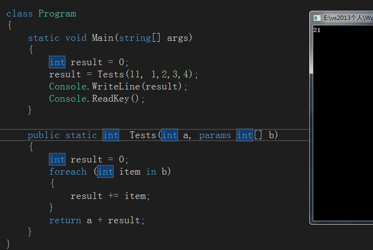 C#定义函数是为了提供一个可供整个应用程序使用的代码块,从而减少重复的代码或者大体相同局部少许差异的代码的使用。一个函数的定义包括可供访问的权限,返回值类型,函数名,参数。返回值的类型必须是返回值类型或者是可以隐式转化成返回值类型的值。调用函数的使用需要参数和定义时的参数类型和数量一致,但是很多情况下有些参数不知道会有多少,个数无法确定。这个时候可以使用参数数组。C#允许为函数指定一个且只有一个参数数组,这个参数允许使用数量不定 的参数调用函数,但是必须使用params关键字。