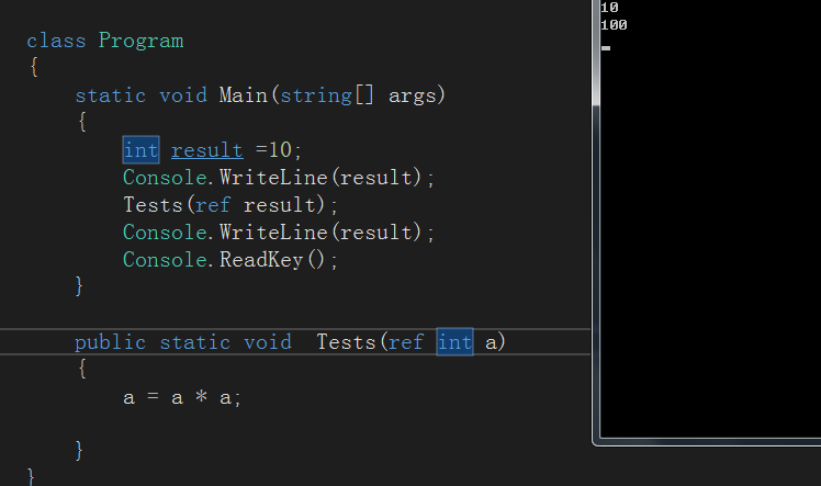 再看上面的例子中不难看到,这样满足多个参数,但有人会说了上面的只是返回一个值给我,如果我不想要上面返回值,太麻烦。但是我Mian函数里面的result一样的可以获取到这个方法的结果怎么办?这个就说到我们传入参数的类型了。上面例子我们不难看出,我们都是把一个值给参数然后它去运算,得到结果再给我们赋值。我们对参数怎么修改其实都不会影响到原本的值。但是如果我们使用引用传递结果就不一样了。所以我们使用另一个关键字ref。