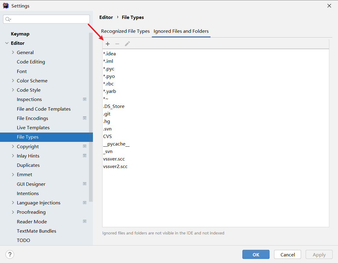 第四步: 点击 "+" 号 按钮 添加 提交 代码要忽略的 文件 ,比如 : iml , .idea(文件夹)