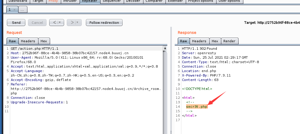 这个时候想到使用burpsuite抓包,抓包之后再发送到repeater,send之后看到一个secr3t.php文件,访问。