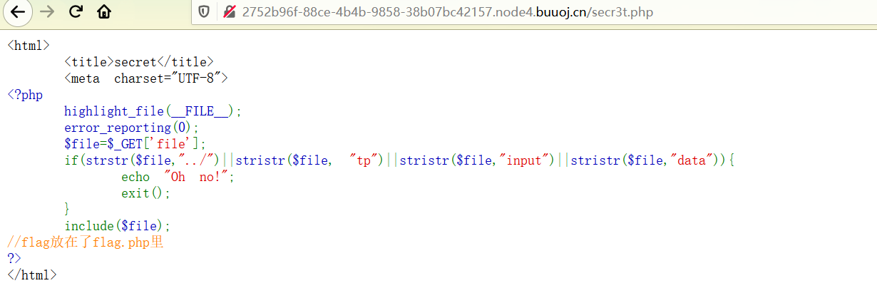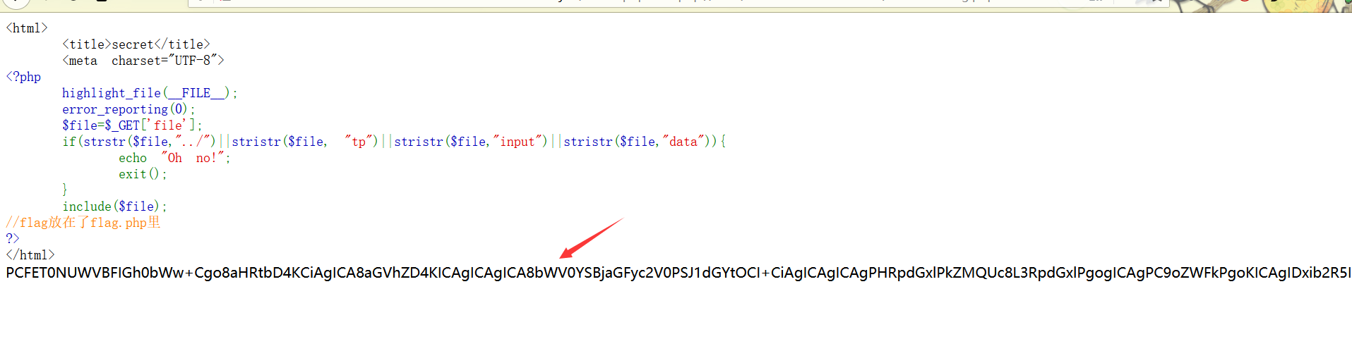 直接访问flag.php没有信息,源码也没有,说明flag不在前端,这个时候联系之前看到的secr3t.php里面写到的include文件包含,想到应该是使用php://filter读取源码