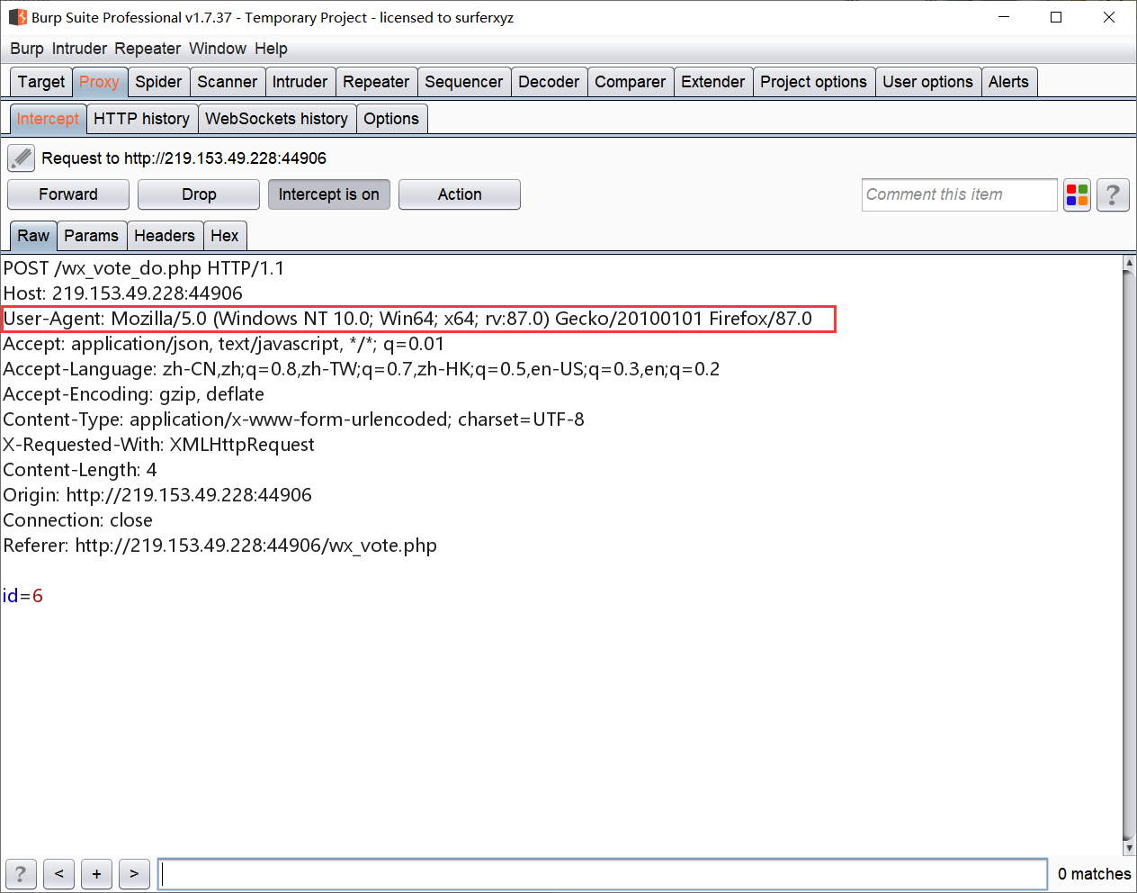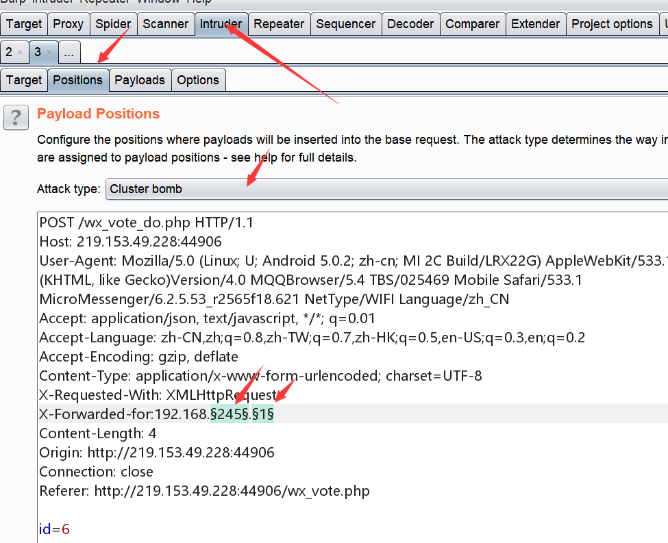 等,这里主要记录一下课后做的实验,通过burp suite抓包改包,修改自己的浏览器信息伪造成微信端访问,添加X-Forwarded-for,然后再通过burp suite修改X-Forwarded-for的ip伪造不同ip投票。这里的X-Forwarded-for参数主要是显示消息经过了几次代理,IP来源的。