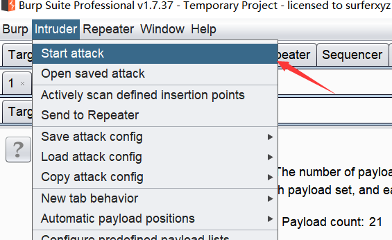 这个时候使用burp suite的批量提交请求功能,添加:X-Forwarded-for参数,将IP设为变量,然后进行攻击