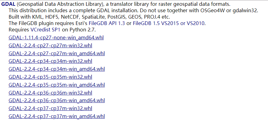 GDAL的下载路径如下:https://www.lfd.uci.edu/~gohlke/pythonlibs/#gdal,需要注意的是下载的GDAL的版本需要和自己计算机上安装的python版本一致,并选择和自己计算机位数(32位/64位)一致的版本下载。