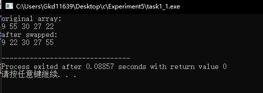 #include <stdio.h> #define N 5 void output(int x[], int n); int main() { int x[N] = {9, 55, 30, 27, 22}; int i; int k; // 用于记录最大元素的下标 int t; // 用作交换两个数组元素的中间变量 printf("original array:\n"); output(x, N); k = 0; for(i=1; i<N; ++i) if(x[i] > x[k]) k = i; if(k != N-1) { t = x[N-1]; x[N-1] = x[k]; x[k] = t; } printf("after swapped:\n"); output(x, N); return 0; } void output(int x[], int n) { int i; for(i=0; i<n; ++i) printf("%d ", x[i]); printf("\n"); }