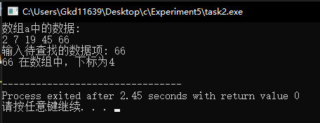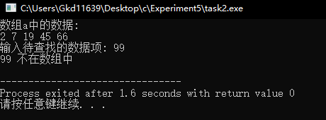 #include <stdio.h> #define N 5 int binarySearch(int x[], int n, int item); // 函数声明 int main() { int a[N] = {2, 7, 19, 45, 66}; int i, index, key; printf("数组a中的数据:\n"); for (i = 0; i < N; i++) printf("%d ", a[i]); printf("\n"); printf("输入待查找的数据项: "); scanf("%d", &key); // 调用函数binarySearch()在数组a中查找指定数据项key,并返回查找结果给index // 补足代码① index = binarySearch(a, N, key); if (index >= 0) printf("%d 在数组中,下标为%d\n", key, index); else printf("%d 不在数组中\n", key); return 0; } //函数功能描述: //使用二分查找算法在数组x中查找特定值item,数组x大小为n // 如果找到,返回其下标 // 如果没找到,返回-1 int binarySearch(int x[], int n, int item) { int low, high, mid; low = 0; high = n - 1; while (low <= high) { mid = (low + high) / 2; if (item==x[mid]) return mid; else if (item<x[mid]) high = mid - 1; else low = mid + 1; } return -1; }
