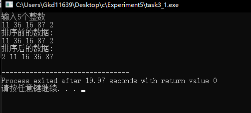#include <stdio.h> #define N 5 // 函数声明 void selectSort(int a[], int n); void input(int a[], int n); void output(int a[], int n); int main() { int a[N]; printf("输入%d个整数\n", N); input(a, N); printf("排序前的数据:\n"); output(a, N); selectSort(a, N); // 调用selectSort()对数组a中的N个元素排序 printf("排序后的数据:\n"); output(a, N); return 0; } // 函数定义 // 函数功能描述:输入n个整数到数组a中 void input(int a[], int n) { int i; for (i = 0; i < n; i++) scanf("%d", &a[i]); } // 函数定义 // 函数功能描述:输出数组a中的n个整数 void output(int a[], int n) { int i; for (i = 0; i < n; i++) printf("%d ", a[i]); printf("\n"); } // 函数定义 // 函数功能描述:使用选择法对数组a中的n个整数由小到大排序 void selectSort(int a[], int n) { int i, j, k, temp; for (i = 0; i < n - 1; i++) { k = i; // k用于记录当前最小元素的下标 for (j = i + 1; j < n; j++) if (a[j] < a[k]) k = j; // 如果a[j]比当前最小元素还要小,就更新k,确保它总是存放最小元素的下标 if (k != i) { // 找到最小元素后,交换a[i]和a[k] temp = a[i]; a[i] = a[k]; a[k] = temp; } } }