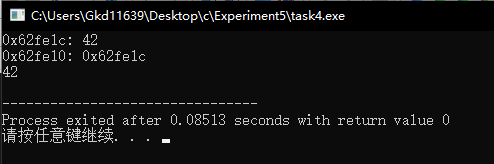 答:整形变量n的地址是0x62fe1c,存放的数是整数42;指针变量pn的地址是0x62fe10,存放的是整形变量n的地址0x62fe1c;通过 *pn 间接访问的是整形变量n。