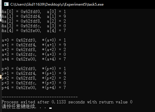 #include <stdio.h> #define N 5 int main() { int a[N] = {1, 9, 2, 0, 7}; int i; int *p; for(i=0; i<N; ++i) printf("&a[%d] = %#x, a[%d] = %d\n", i, &a[i], i, a[i]); printf("\n"); for(i=0; i<N; ++i) printf("a+%d = %#x, *(a+%d) = %d\n", i, a+i, i, *(a+i)); printf("\n"); p = a; for(i=0; i<N; ++i) printf("p+%d = %#x, *(p+%d) = %d\n", i, p+i, i, *(p+i)); return 0; }