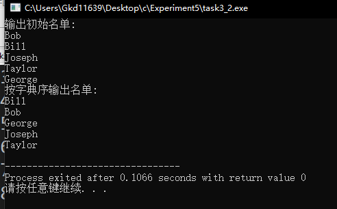 #include <stdio.h> #include <string.h> #define N 5 void selectSort(char str[][20], int n); // 函数声明,两维数组作为函数参数 int main() { char name[][20] = {"Bob", "Bill", "Joseph", "Taylor", "George"}; int i; printf("输出初始名单:\n"); for (i = 0; i < N; i++) printf("%s\n", name[i]); selectSort(name, N); // 调用选择法对name数组中的字符串排序 printf("按字典序输出名单:\n"); for (i = 0; i < N; i++) printf("%s\n", name[i]); return 0; } // 函数定义 // 函数功能描述:使用选择法对二维数组str中的n个字符串按字典序排序 void selectSort(char str[][20], int n) { int i, j, k; char temp[20]; for (i = 0; i < n - 1; i++) { k = i; for (j = i + 1; j < n; j++) if (strcmp(str[j],str[k])<0) k = j; if (k != i) { strcpy(temp, str[k]); strcpy(str[k], str[i]); strcpy(str[i], temp); } } }