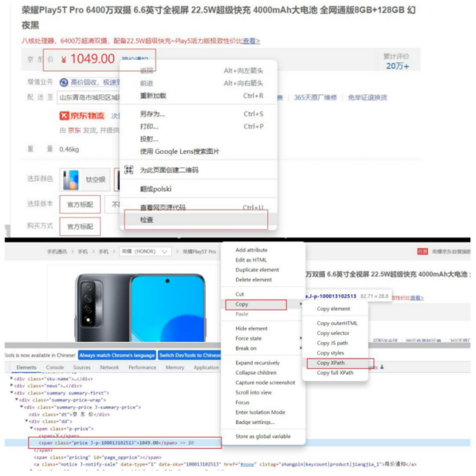 第三步:分析网页结构。找到数据项所在XPath。推荐使用Chrome浏览器,打开要采集的网页,如下图所示,我们要找到手机信息所在网页元素的XPath。