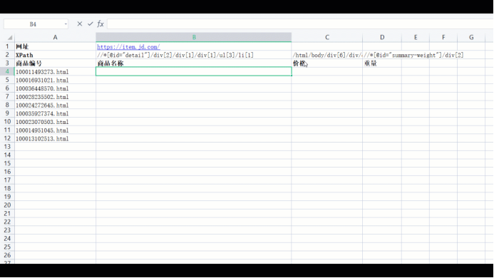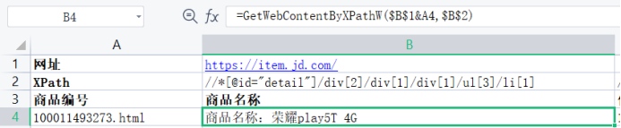 第四步:写公式GetWebContentByXPathW( url, xpath)。url参数传入拼接的网址,xpath用找到数据项。如下图所示: