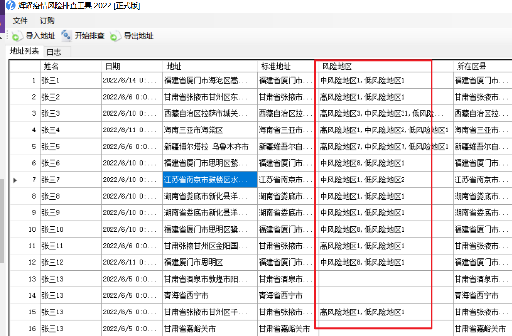- 自动排查,工具会将地址国家最新疫情风险地区数据库进行比对,自动排查区县一级的高中低风险数量。