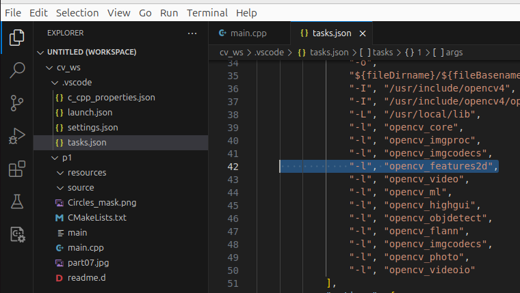{ "configurations": [ { "name": "Linux", "includePath": [ "${workspaceFolder}/**", "/usr/include/opencv4/**", "/usr/include/opencv4/opencv2/**" ], "defines": [], "cStandard": "c17", "cppStandard": "gnu++17", "intelliSenseMode": "linux-gcc-x64" } ], "version": 4 }