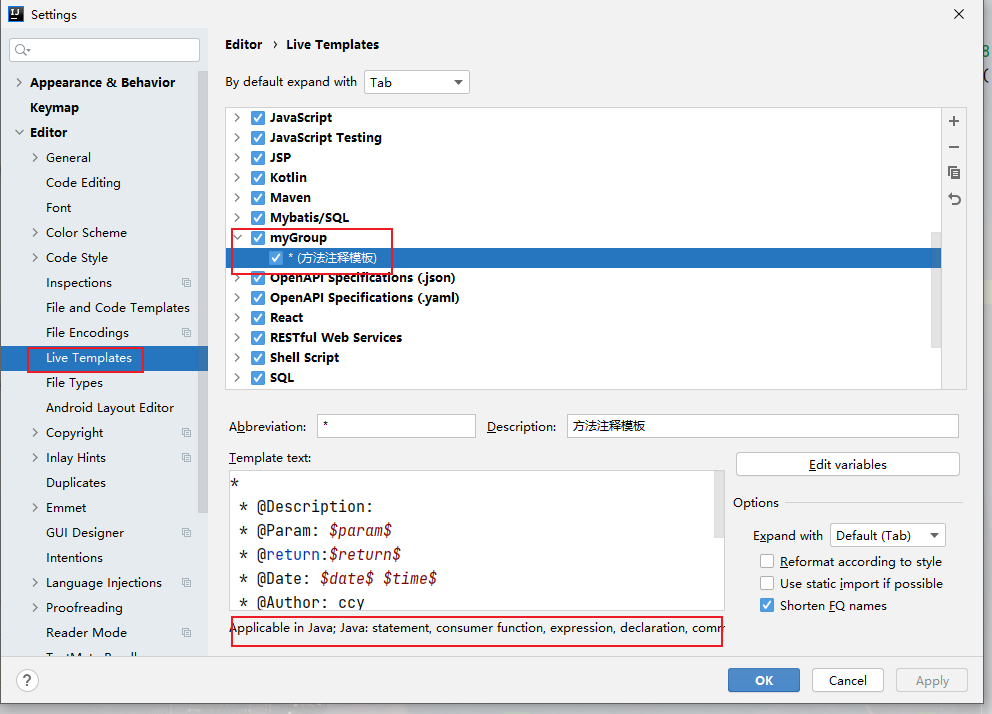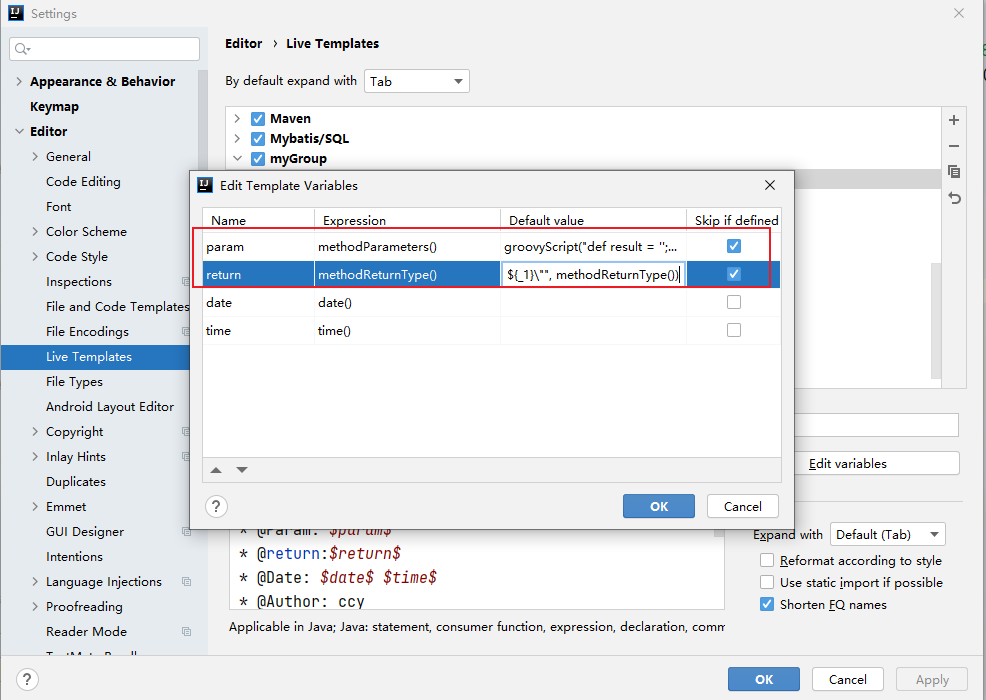 idea方法注释模板配置