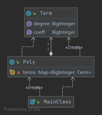 - 思路:将输入的表达式分为表达式和项两个层级,分别用一个类来进行存储。Poly类中以Map存储各个Term,关键字为每个Term的指数,便于合并;Term类中直接以系数和指数的方式存储幂函数。最终以Poly类的求导函数调用Term类的求导函数,完成表达式的求导。